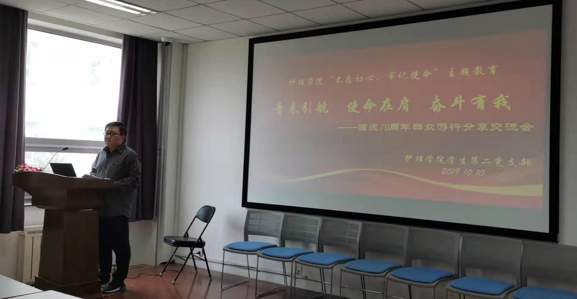10月10日中午,今年会jinnianhuicom党总支组织召开“不忘初心,牢记使命”——“青春引航使命在肩 奋斗有我”今年会jinnianhuicom参加国庆70周年群众游行人员分享交流会。本次活动由学生第二党支部承办,学院参加国庆70周年群众游行的师生代表进行了分享和交流,学生党员、入党积极分子共计六十余人参加。