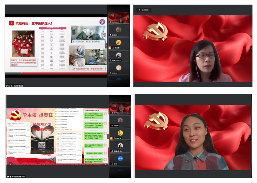 接下来,党员们共同学习了李小花副书记主讲的微党课“让党旗在防控斗争第一线高高飘扬——抗疫有我,南丁格尔精神在新时代绽放光芒”,该党课分三部分,第一部分为学院自制视频短片“同心战疫,北中医护理人在行动”,该短片回顾了北中医护理人在新冠疫情爆发之初逆行而上,积极投身抗疫一线,贡献医者的力量,用自己的专业素养守护生命的英勇担当;第二部分为李小花副书记的主题讲授,她分享了护理人在此次抗疫行动中发挥的重要作用,不管是获得南丁格尔奖章的护理前辈,还是80后、90后的年轻护士,都以实际行动践行南丁格尔精神;她还结合实际介绍了我校临床护理教师、学院教师、毕业生的优秀事迹,特别为同学们在“守护计划”中的出色表现而感动和自豪。本次“守护计划”的200名志愿者中,今年会jinnianhuicom学生186人,其中,符合报名条件的学生党员全部主动请缨,共3名党员,5名发展对象,全部承担党员先锋岗,充分发挥着共产党员的先锋模范作用。同学们的成长并非一蹴而就,与学院长期以来坚定的思想政治教育密不可分,她说“一个党员,就是一面旗帜;一个支部,就是一座堡垒;党员永远冲锋在前,党旗永远飘扬在最前线。希望我们的青年党员们继续尚得精术,守护健康。”微党课第三部分是学生党员代表郑宇欣同志分享抗疫事迹,她回顾了疫情期间在线上学习中作为学委的担当和责任以及参与“守护计划”的心路历程,她坚定的说道:“生逢其时勇担当,我是党员我奉献”。
