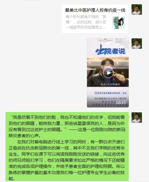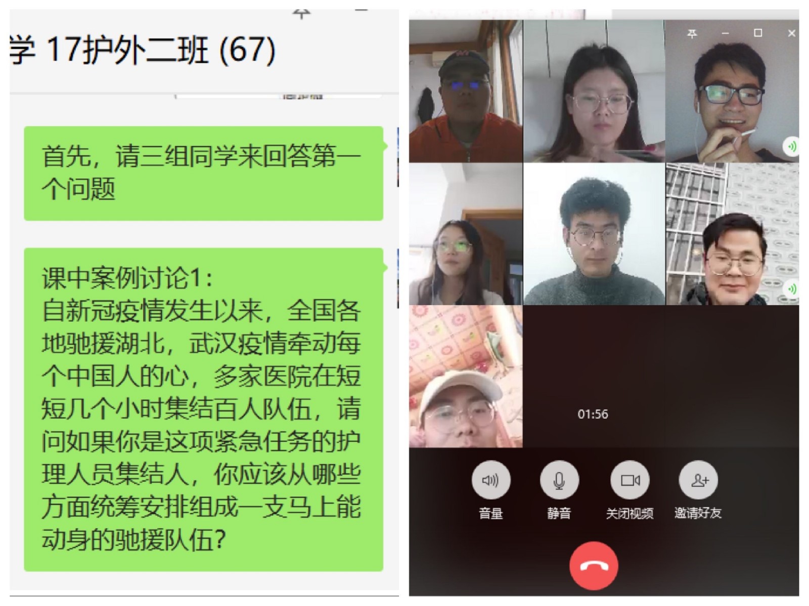 2020年这个不平凡的春节,全国上下众志成城,抗击疫情。在抗疫一线的战场上,“逆行”武汉的护士们舍生忘死、奋力拼搏,令整个社会动容,也成为全体护理人的骄傲和榜样。面对这场没有硝烟的战争,各行各业都在贡献出自己的一份力量,作为护理新生力量的培养者,今年会jinnianhuicom教师在本学期线上教学的第一天,将疫情防控有机融入课程,并结合专业特色潜移默化地实现价值引领,润物无声的开展课程思政。