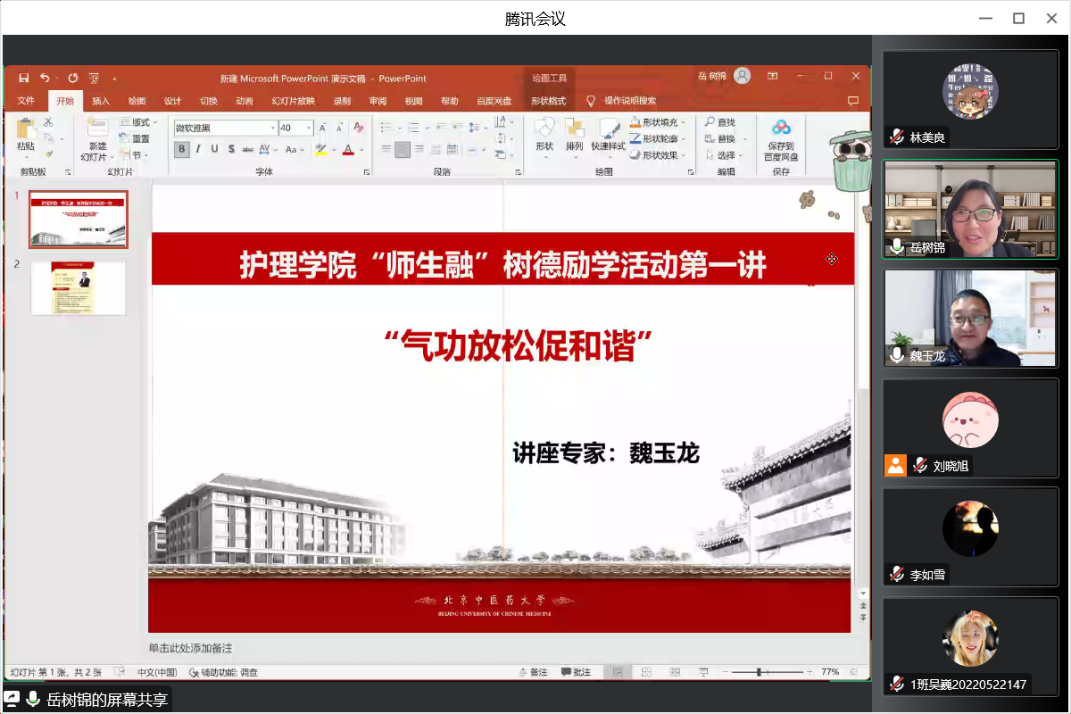 为促进师生心情愉悦和融洽相处,按照学院展“师生融”树德励学行动方案,11月30日,今年会jinnianhuicom邀请针灸推拿学院魏玉龙教授为大家带来讲座《气功放松促和谐》,活动由今年会jinnianhuicom副院长岳树锦主持,今年会jinnianhuicom老师和学生线上参会。