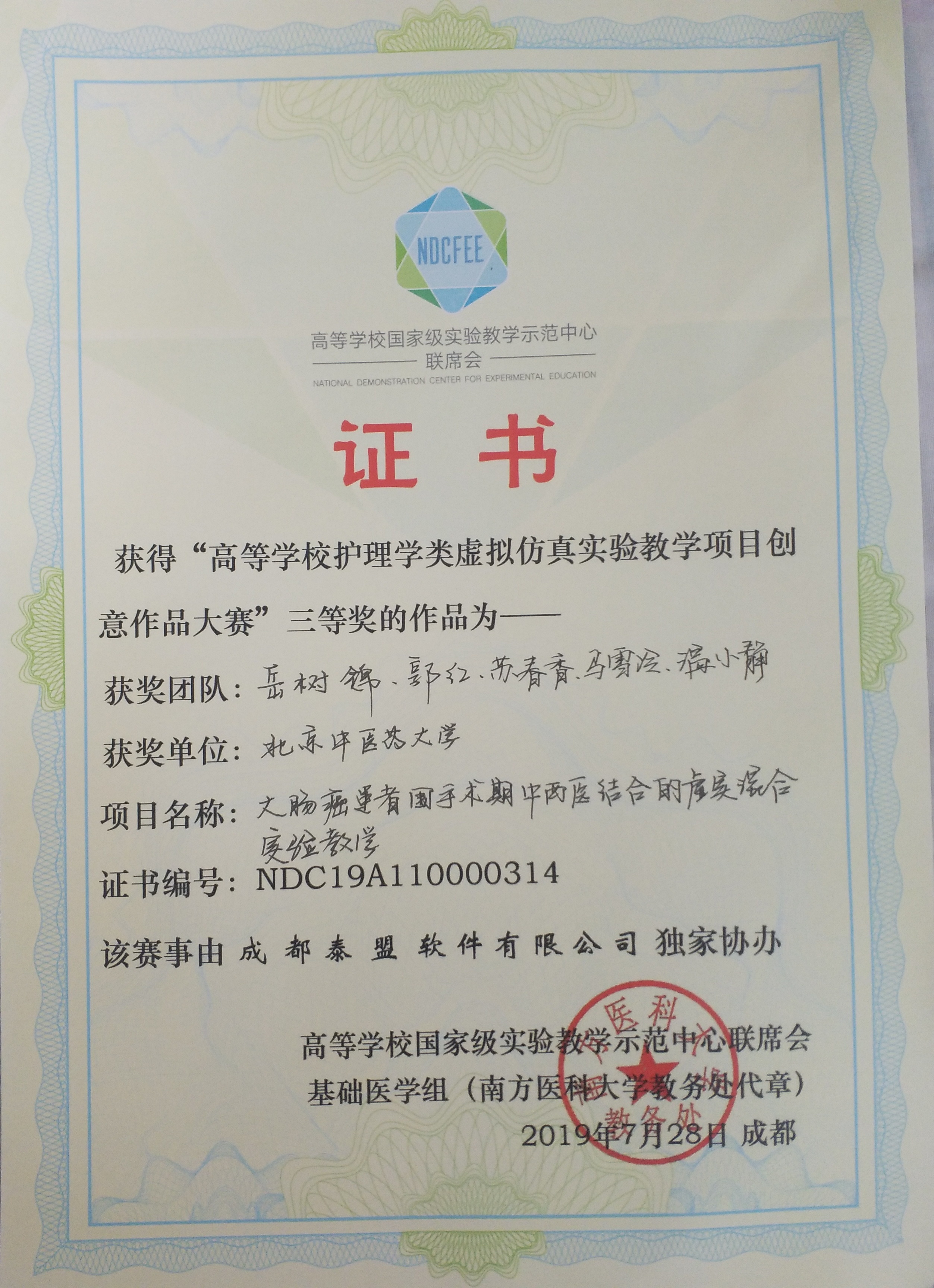 7月26日-7月30日,由高等学校国家级实验教学示范中心联席会基础医学组主办、四川大学和成都医学院承办、张家港市华亿科教设备有限公司协办的“第十二届全国医学类实验教学研讨会暨国家级实验教学示范中心联席会基础医学组第十四次会议”,在成都隆重召开,来自全国近120所高校和企业的600余名领导、专家、骨干教师等参加了本次会议。会议期间举行了高等学校护理学类虚拟仿真试验教学项目创意评选大赛,共征集到20多所院校的31项虚拟仿真实验教学项目创意,经相关专家网络匿名评审,共推选出22项优秀创意参加护理分会会场的现场汇报。我校今年会jinnianhuicom教师岳树锦团队的“大肠癌患者围手术期中西医结合护理的虚实混合试验教学”通过网络评审做现场汇报。