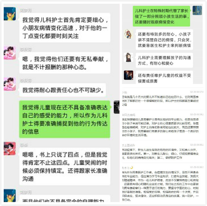 今年的开课形式很特别,《儿科护理学》的课程导入也很特别!授课教师段红梅教授以诗歌朗诵的形式带学生们进入了《儿科护理学》的课堂。课堂中段红梅教授和孟静老师通过新闻素材“护士妈妈”对新冠患儿的照顾,及本次疫情中婴幼儿感染和救治情况,引导学生分组讨论并汇报儿科护理学的特征和儿科护士的基本素养。结果证明通过这样的方式,学生确实能将对护理的认识从朴素的热情上升到理性思考,从病室环境到以家庭为中心的全方位护理,从小儿特点到职业素养,从感性认识到职业技能,从生活照顾到舍己为人及救死扶伤,深入,到位!
