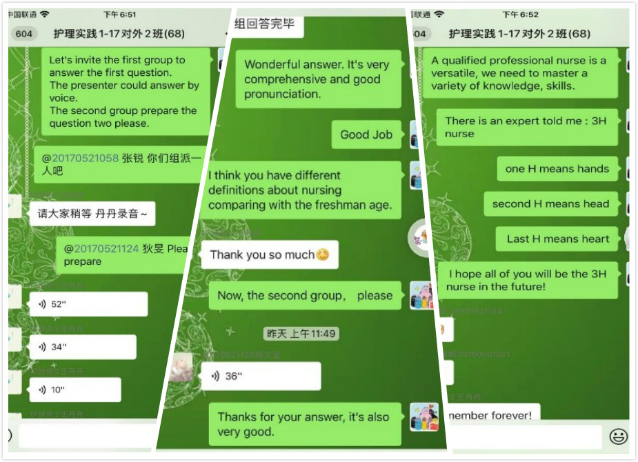 《护理实践I》(双语)课是我校对外交流模块的特色课程,课程组周芬和孟静老师在课前周密设计教学方案,精心拍摄学习指导和重点知识微课,多次进行BB平台和微信群测试,保证疫情期间课程顺利开展。课中学习安排有序,多渠道答疑解惑。根据本课程的特点,教师结合疫情设置思考题,学生分组讨论,并使用英文汇报,按单元测试检验学习效果,拓展抗疫演讲英语听力资料。课后积极收集学生反馈,听取督导专家意见,及时调整,不断完善。