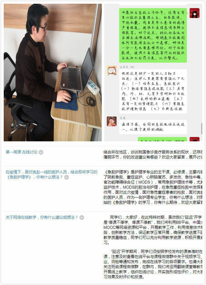 《急救护理学》通过建立学习小组,充分利用并挖掘BB平台、微信群的功能特点,打通课上课下,在BB平台创建师生论坛,就学习方法、课程讨论、在线教学等主题广泛听取学生反馈、意见和建议,课前学生学习中国大学MOOC相关课程及BB平台上的教学资源,有问题可通过论坛或微信交流,课上学习教师录制的微课视频,采用提问、答疑、辅导、交流、讨论、测验等方式加强课堂组织管理,课后引导学生形成课堂笔记,在论坛发帖留言,并以学习小组为单位完成课后讨论作业,第一周的主题是“结合所在地区,谈谈我国急诊医疗服务体系的现状,还存在哪些薄弱环节,改进建议”,师生交流,生生互动,共同进步。