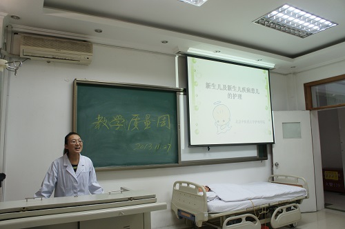 第一阶段于2013年11月27日中午12:10在护理楼四层示教室举行。首先是青年教师试讲,三位新教师根据下学期的教学任务分别进行了20分钟的试讲。通过试讲可以看出各位年轻老师准备充分,讲课内容熟练,PPT制作精美,声音清晰宏亮,仪表大方。每位教师试讲后,参与活动的老师们纷纷给与肯定,也分别指出不足之处并提出具体建议。其次是老教师进行示范教学,由郭红老师示范密闭式输液,其边示教边讲解每一步骤的关键点和注意事项,对于模棱两可的步骤,大家展开讨论,达成共识,将输液流程进行了规范和统一,整个活动气氛轻松活跃,达到了预期效果。