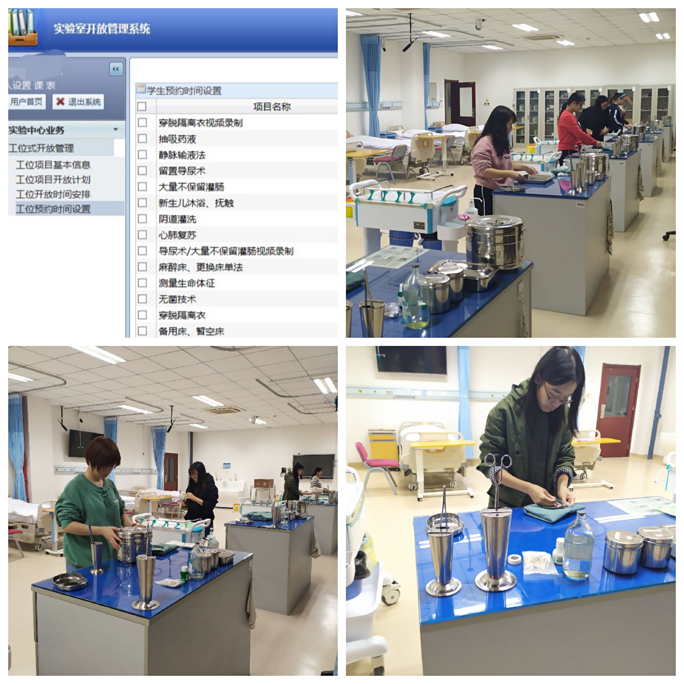 在教务处的大力支持下,护理实验中心利用学校的实验室与实践教学管理系统,通过与工程师对接、提出需求,初步完成了实验室开放预约管理系统,预约系统于2018-2019学年第二学期试运行,在使用过程中发现问题后及时和工程师沟通,经过反复调试,逐步完善了该系统,本学期正式运行。目前累计预约开放11978人时数,涉及《护理学基础》、《急救护理学》、《妇产科护理学》3门护理专业课的11个实验项目,包括抽吸药液、静脉输液、留置导尿术、大量不保留灌肠、铺床法、无菌技术、穿脱隔离衣、测量生命体征、CPR、新生儿沐浴、新生儿抚触等,目前运行状态良好。课后网上预约平台便于学生利用自己的业余时间实施课后练习,根据自己掌握实验技术的程度,在预约规定时间上限内选择时长,实现了课后学习的自主性,同时平台能够自行统计开放数据便于课后管理,提升了实验中心信息化水平。