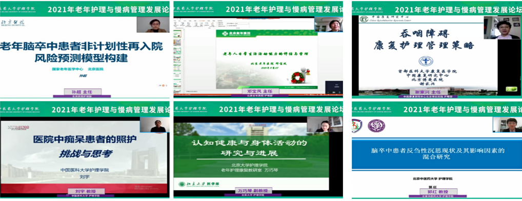 北京医院护理部孙超主任、北京老年医院护理部邓宝凤主任、中国康复研究中心北京博爱医院护理部谢家兴主任、中国医科大学今年会jinnianhuicom刘宇教授、北京大学今年会jinnianhuicom万巧琴副教授和今年会jinnianhuicom郭红教授等专家分别讲述了脑卒中、老年认知障碍患者的常见的临床问题及其应对、积极心理学应对、运动干预等系列研究进行了分享。
