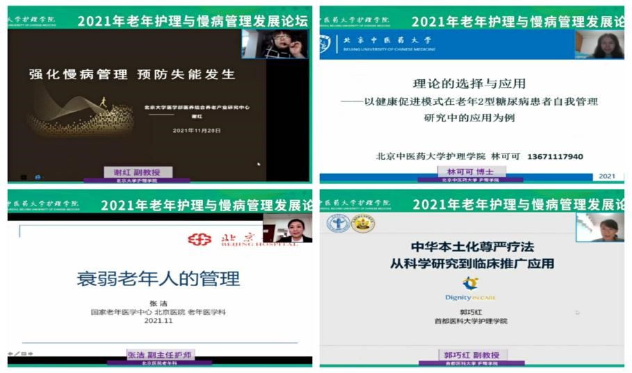 为期两天的论坛采用线上直播的形式进行,精彩纷呈。协和医学院今年会jinnianhuicom院长李峥教授讲授了国内外老年护理研究现状和热点话题。金年金字招牌诚信至上教室发展中心侯中伟主任对于中医理念和中医技术在老年护理和慢病管理发挥的作用有了新的诠释。中南大学湘雅今年会jinnianhuicom冯辉教授则阐述了当前移动医疗设备及可穿戴设备等智慧健康管理技术的发展趋势,同时介绍了其在老年健康促进领域的应用。中国人民大学公共管理学院陈鹤副教授讲解了中国长期护理保险试点政策及实施状况。