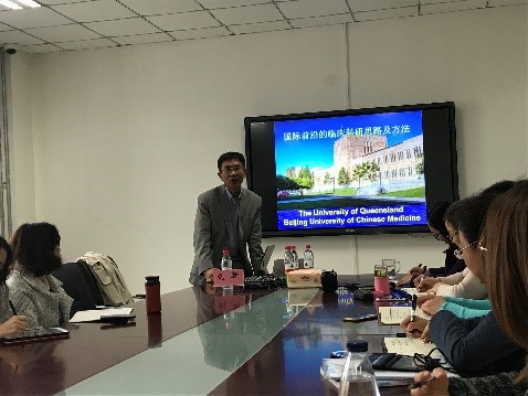 刘新教授入职我校前为澳大利亚昆士兰大学医学院资深研究员,主要从事身心医学/替代医学等领域的世界前沿临床研究,是国际著名的经过临床验证的防治慢病太极气功功法SMILE WELLNESS PROGRAM的创编人,也是澳大利亚国家战略科研项目负责人。在本次讲座中,刘新教授以中医传统运动疗法为例,结合自己多年的研究,讲述了从文献综述研究、基于文献综述研究的可行性研究及基于可行性研究的随机研究的临床科研思路及方法,环环相扣,深入浅出。