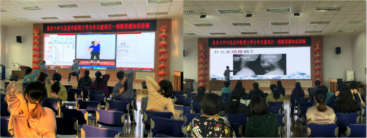 4月12日下午,今年会jinnianhuicom与良乡六中合作共建项目颈椎保健的健康教育讲座在良乡六中多功能大厅顺利开幕。活动由今年会jinnianhuicom团委书记李想老师主持,中医学院杨思红和赵克勤同学担任主讲。本次的主题是“基于中医运动疗法的颈椎保健操宣讲”,主要内容为向在校教师宣传普及颈椎保健知识和预防颈椎病的常识方法。首先由赵克勤同学介绍颈椎病相关知识,内容涉及颈椎解剖知识,传统医学和现代医学对于颈椎病的认识以及颈椎病的分型;随后由杨思红同学进行颈椎保健相关知识的讲解,内容涵盖了保健的方式方法,穴位按摩以及颈椎保健操等内容;最后在同学的示范和视频的讲解下,老师们一起学习颈椎保健操。通过与到场教师们的互动,我们发现虽然现在教师群体的工作方式正在逐渐发生改变,各类保健信息愈加丰富,但是教师们对于认识和保护自身健康仍然不足,需要更多科普宣讲活动来改变现状。