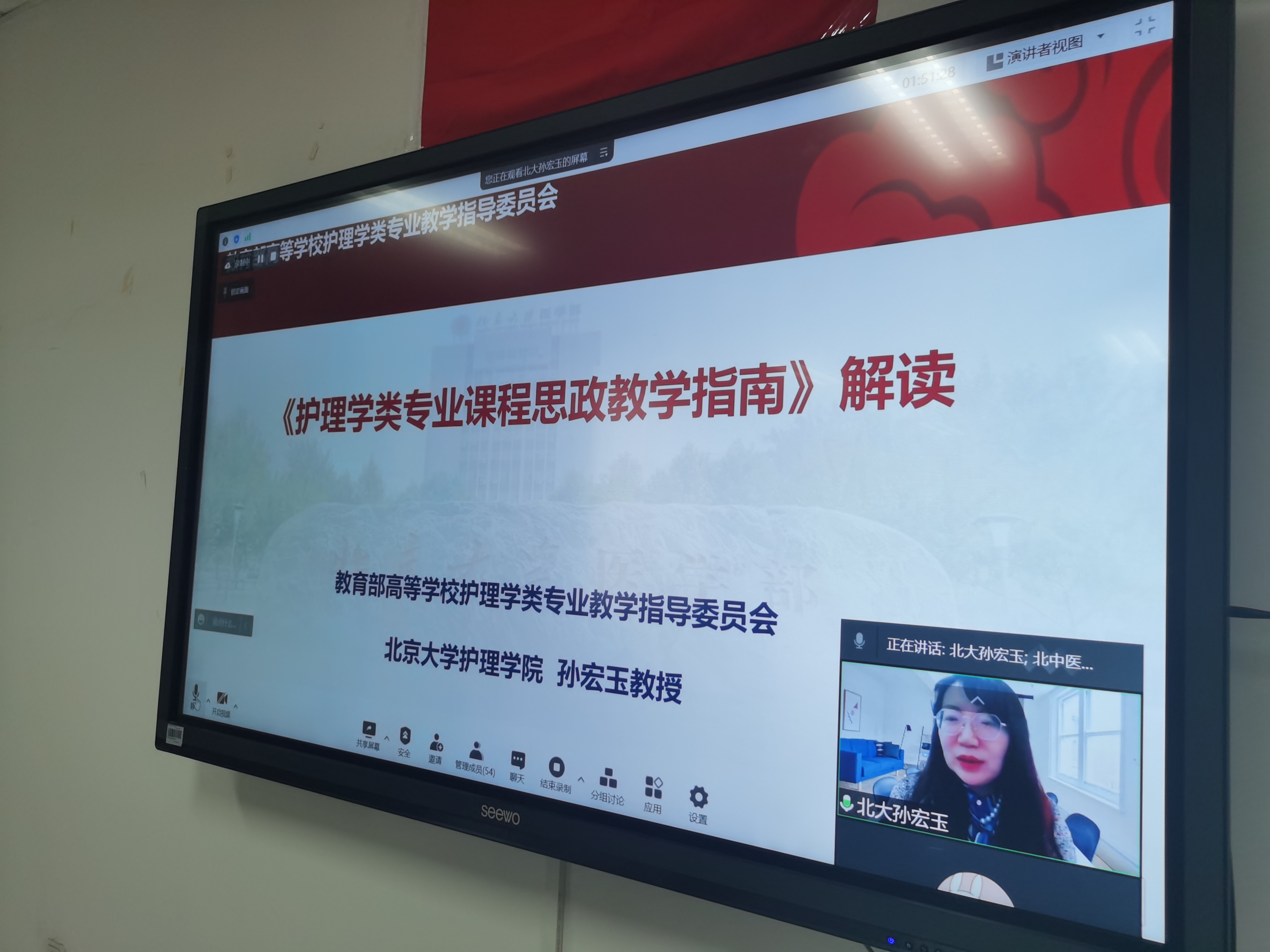 为了全面落实立德树人根本任务,深入推进课程思政建设工作,全面提高专业教师育人能力,3月9日,今年会jinnianhuicom邀请护理学类教职委秘书长北京大学今年会jinnianhuicom孙宏玉教授做了关于《护理学类专业课程思政教学指南》解读的专题讲座。讲座由岳树锦副院长主持,学院领导班子、全体教师和临床学系上百名临床教师参与学习。