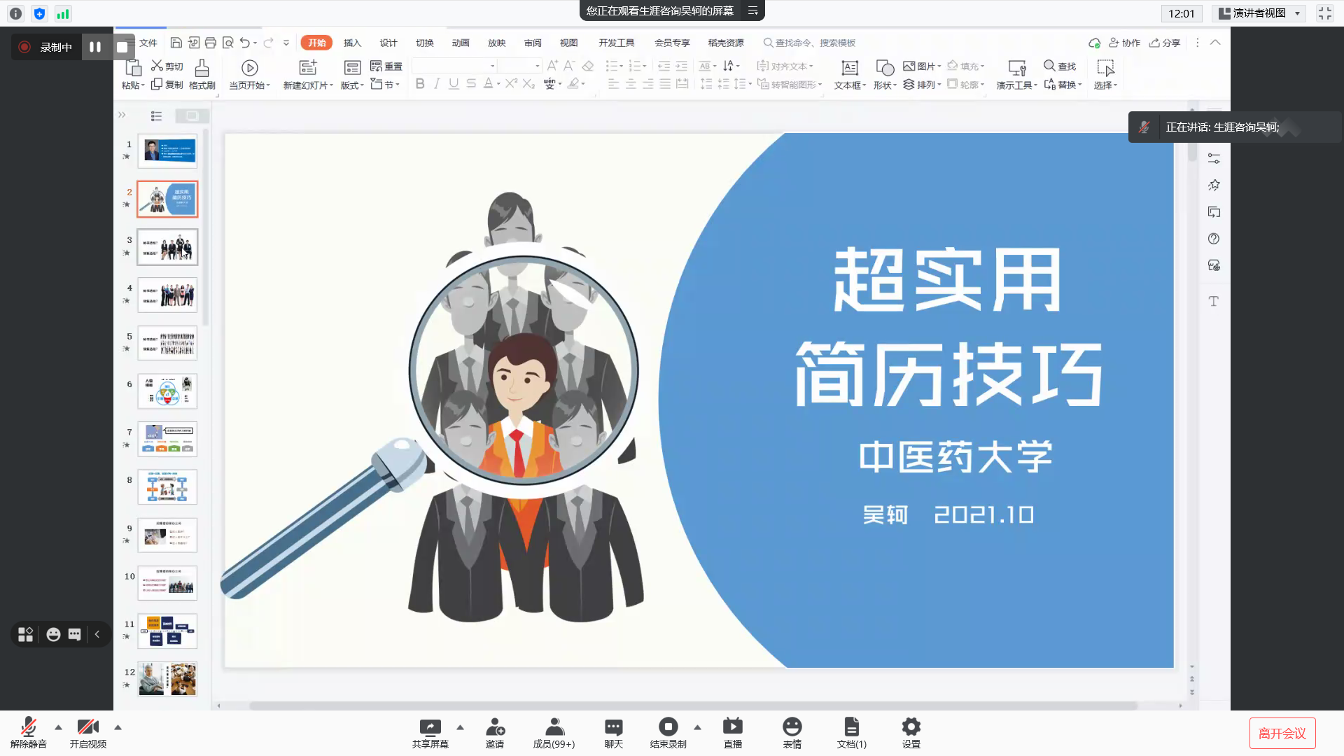 为帮助同学们提高简历制作水平、掌握就业择业主动权,10月21日晚19:00,今年会jinnianhuicom举办护你前行就业专项活动之毕业生简历制作培训讲座,活动邀请国家职业生涯规划师吴轲老师主讲,以促进学生求职为导向,主要内容围绕简历制作方法与求职技巧展开。本次活动由今年会jinnianhuicom就业专员孙雪敏老师主持,2022届本科、硕士研究生共200余人参加培训。
