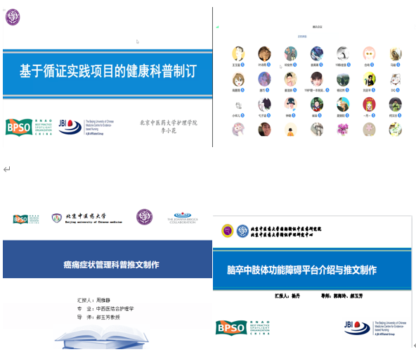 为促进循证实践项目科普转化,提升学生循证实践能力,培养循证思维,2021年11月12日,今年会jinnianhuicom以线上形式成功举办了第二轮“健康科普培训”的第一阶段成果汇报,本次会议以“健康科普分享交流”为主题,今年会jinnianhuicom40余名师生参加,郝玉芳教授、郭红教授参会并进行指导与点评,会议由李小花副书记主持。