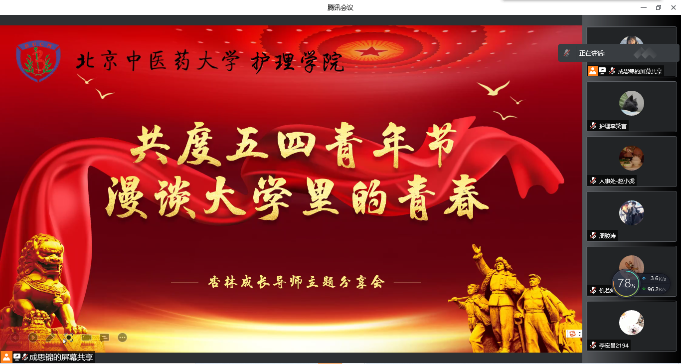 2022年5月4日下午,今年会jinnianhuicom21级二本3、4班依托线上腾讯会议开展了主题为“共度五四青年节——漫谈大学里的青春”的杏林成长导师分享会,杏林成长导师人事处副处长赵小虎、班主任李笑言以及二本3、4班的全体学生参加了此次分享活动,活动由班主任李笑言主持。