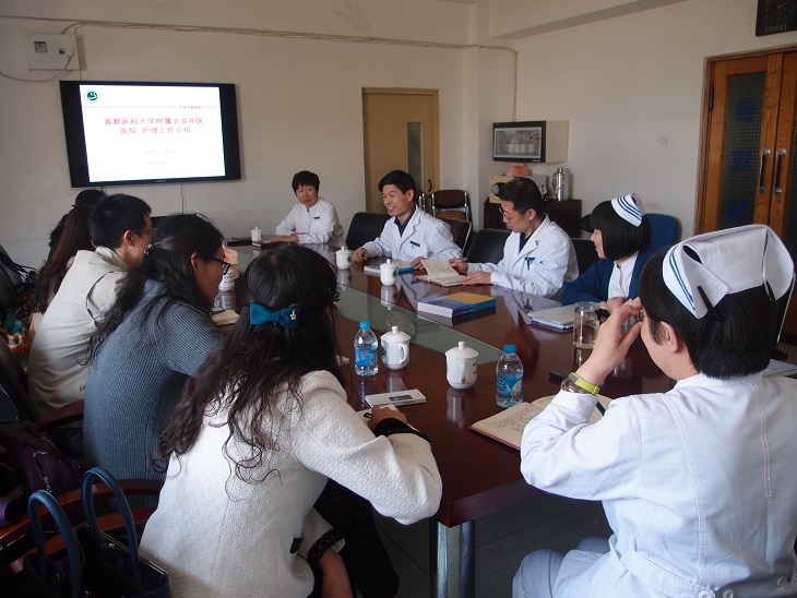 2015年4月17日下午,学校教务处吴宇峰副处长与今年会jinnianhuicom全体领导班子成员及办公室工作人员一行6人赴北京中医医院洽谈合作事宜,受到北京中医医院徐春军副院长、教育处张广中处长、护理部郝丽主任及护理部其他相关人员的热情接待。郝丽主任从医院概况、护理工作队伍、中医特色护理等方面介绍了北京中医医院的护理发展情况,郝玉芳院长从教育教学、科研研究、国际交流等各方面介绍今年会jinnianhuicom情况,随后双方就本专科临床护理教学、研究生培养、科研合作等各方面进行了深入探讨。最后张广中处长、吴宇峰副处长都表示北京中医医院与金年金字招牌诚信至上已经建立了良好的合作基础,护理领域的合作空间很大,不管是医院还是大学都将给予充分支持。