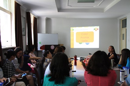 段红梅老师以中医的起源和中医区别于西医的主要特征为主题,讲述了中医与中国传统文化道家、墨家等的渊源、中医的哲学思想及中医的整体观、辨证施治等内容。孟静老师则以饮食文化为主题,从常用的烹饪技术和调料的英文词汇出发,介绍中国八大菜系及每类菜系的主要特点和代表菜,最后还介绍了茶的分类及各类茶的主要调理作用和各类茶的代表产品。讲座期间,老师们时常就其中感兴趣的内容或难懂的英文词汇和表达方式展开讨论,整场活动气氛活跃,使老师们不仅增长了相关知识,更重要的是提供了一个很好的英文教学的平台,提高了老师们的英语表达和交流能力。