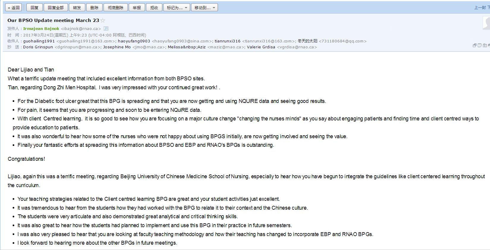 本次视频会议历时1小时,会后,Dr.Irmajean还特意发送邮件对我们所取得的成果表示了祝贺和鼓励,希望能够继续开展相关工作,也期待着下一次视频会议中我们的汇报。