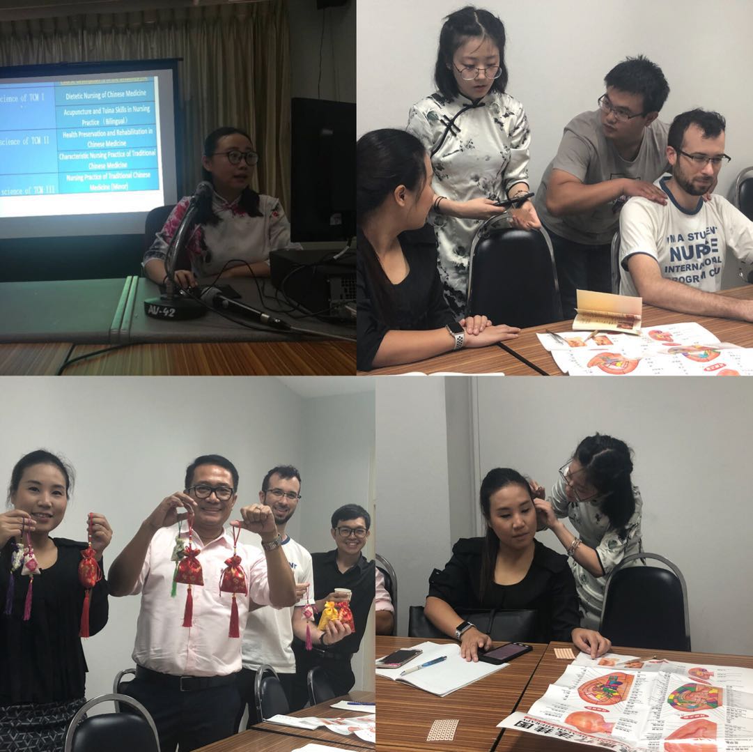 学习交流期间,双方就社区护理学和人文护理学、中泰护理教育差异等问题进行了深入探讨;孙雪敏向国外师生介绍了中医护理的特色及我院护理科研等基本情况,学生们则现场演示了推拿、刮痧等中医特色护理技术,博得了泰国师生的热情参与和欢迎。我院师生通过听课、讲座等形式感受到国外大学开放的教育方式和活跃的课堂氛围,通过参观社区医院及临床见习等活动,看到了地方社区医院的医疗器械及医疗设备,深入了解了泰国地区护理专业及临床的工作情况。在泰期间,师生们也体验到泰国不一样的人文环境和社会环境。
