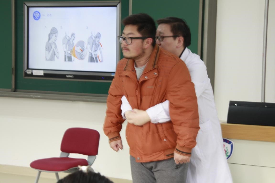 主讲老师演示海姆立克急救法及包扎法
