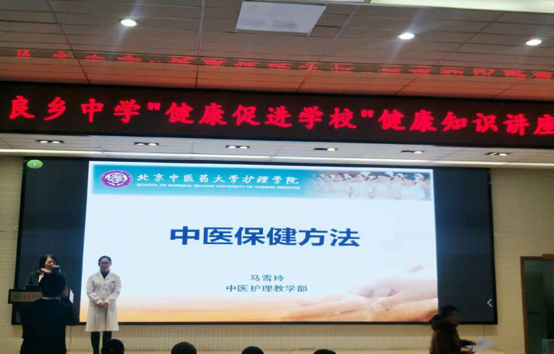 11月30日,今年会jinnianhuicom教师马雪玲和一名研究生前往良乡中学,对60余名教师及家长开展“中医保健方法”健康知识讲座,此次的培训是金年金字招牌诚信至上与良乡中学的共建项目,该项目旨在提高老师、家长的自我保健能力,促进中医药文化的传播。