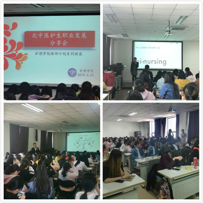 4 月 1 日、2 日中午,今年会jinnianhuicom共计230余名本科学生在护理楼205举办“2019年跟师计划系列讲座第二场——护理职业发展分享交流会”,由我校创新创业基地嘉高喜和健康科技有限公司项目总监李建飞、白杨老师,给热切关注相关问题的今年会jinnianhuicom学生分享护理职业发展之路,反响热烈。