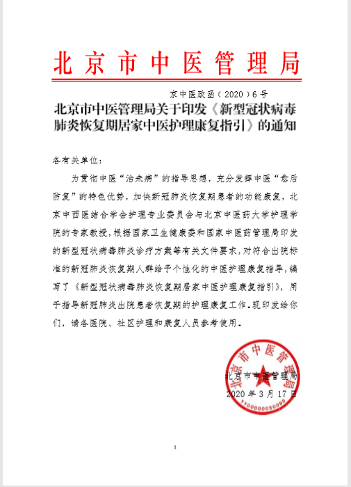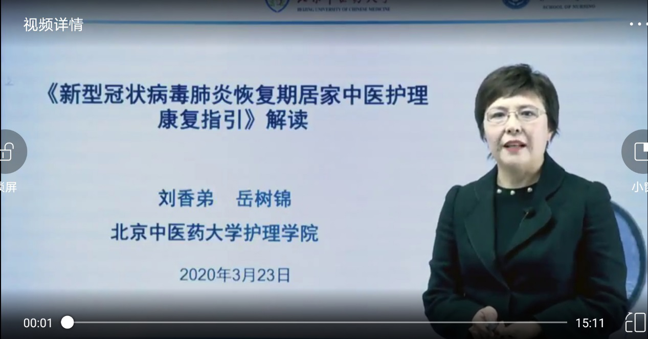 通过对新型冠状病毒肺炎恢复期患者的需求调查,结合中医诊疗方案和防控实践经验,借助中医护理的特色优势,编写形成了《新型冠状病毒肺炎恢复期居家中医护理康复指引》,该指引已被北京市中医管理局推荐并印发,用于指导新冠肺炎出院患者恢复期的护理康复工作。供医院、社区护理和康复人员参考使用。同时刘香弟院长受邀在中医在线教育进行授课,解读《新型冠状病毒肺炎恢复期居家中医护理康复指引》。该指引将翻译为英文版,在中医在线教育进行国际化推广。