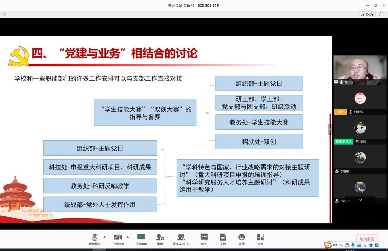 郭辉书记代表学院党总支向赵小虎副部长表示感谢。在疫情防控的特殊时期,以线上会议的方式培训是一次难得的集体学习经历,赵小虎部长案例生动、内容翔实的培训帮助大家更好的明确和吸收了党支部工作的流程和规范,学院党总支将以此为契机,进一步加强党支部工作规范化标准化,提升党建工作质量,加强党建工作与专业、业务的融合,着力打造具有学院专业特色的党建活动。