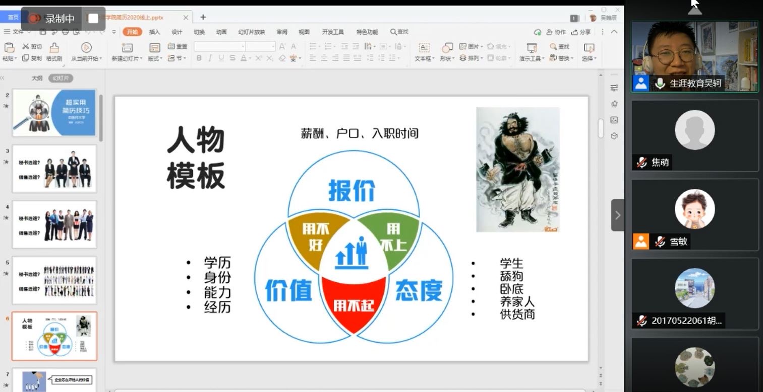 培训开始吴轲老师抛出观点:简历就是推销自己。他以一张“谁做秘书?谁做销售者?”的图片引出话题,引导同学们站在招聘者角度思考岗位需求与目的。吴老师强调,拥有一份简明详实的简历,是在海量应聘者中脱颖而出的重点。吴轲老师以招聘单位的需求角度出发,将简历书写的重点归纳为“报价”、“态度”与“价值”三方面,鼓励同学在简历中正确评估自我能力、明确工作定位,并建议求职同学抓住自身特征,突出就业优势,写实成绩证据,真正将薄薄一页简历纸的作用发挥到极致。
