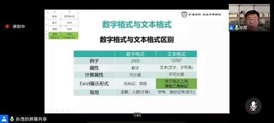 孙茂老师将Excel操作方法分为初阶、进阶、高阶三步进行讲解。首先,孙老师以Excel的功能分区及基础操作为导引,为与会师生演示了快捷键的使用方法并向同学们点出了数据格式与文字格式的区别与快速转换以及计算公式、切片公式、单元格引用的快速使用。随后,孙老师为同学们讲授了数据透视表和数据匹配的应用,引入相关例题和讲授Vlookup函数的使用方法。