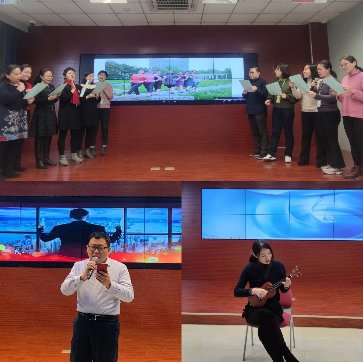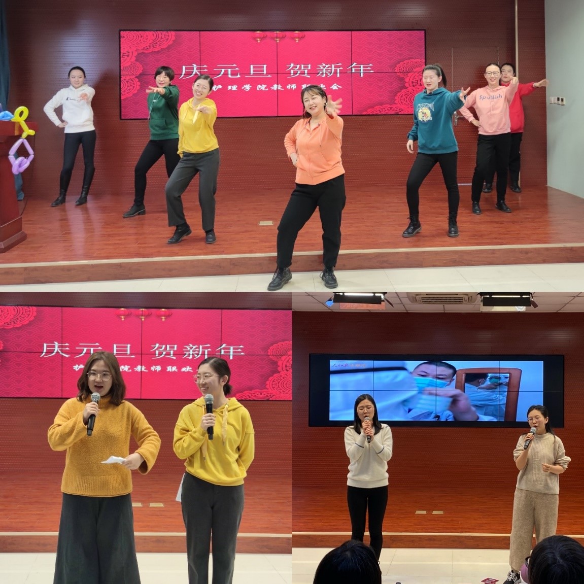 此次联欢会所有的演职人员均为教职工,大家自导自演,自编自唱,一改往日的严肃和沉静,尽展才艺和风采!伴随着动感的旋律,教师联欢会在舞蹈表演《护花使者》中拉开了帷幕,综合办公室教师们轻快的舞步、优美的舞姿展现了学院青年教师的活力和风采。紧接着是歌曲《少年》,随着两位老师深情的演唱,看着视频中最美逆行者的抗疫故事,我们历历在目、热泪盈眶。临床护理教研室的老师们自行填词的说唱歌曲《教师版时间都去哪了》,真真切切唱出了老师们的心声,令大家回味无穷。多才多艺的孙颖老师为大家带来了一首原创歌曲《随风而行》,自弹自唱,优美动听。相声《你压力大吗》诙谐幽默、可爱灵动,收获了全场的掌声和欢笑。以教研室为单位的《你演我猜》互动环节更是将现场的气氛引向了最高潮。最后,王超书记以《我的中国心》作为这场联欢会大轴节目,通过这首歌传递了浓浓的爱国情怀。