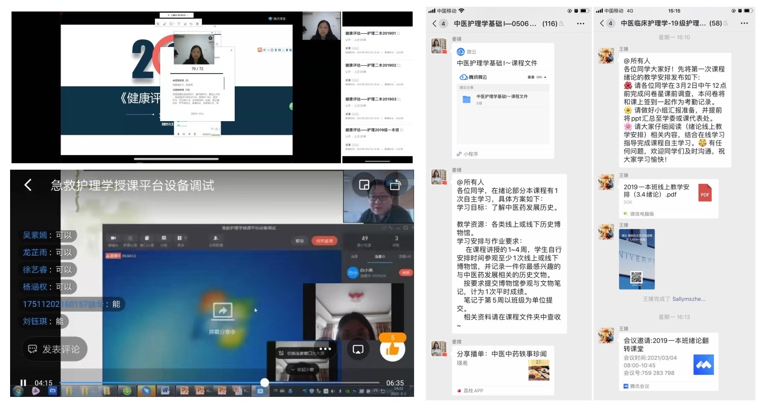 针对教师,学院鼓励教师基于去年线上教学经验,积极探索教育教学改革创新点。首先,课程准备更为充分,各门课程开展有针对性的课前预测试、进一步充实课程资源、制定更加详细的课程学习指导、更贴近临床的教学案例设计、有序的课堂主题汇报方案。其次,注重学生自主学习能力的培养,以我院面向19级学生开设的《中医临床护理学I》课程为例,课前布置学习任务清单,要求学生在课前完成自主学习的教学要求,同时在课前借助问卷星对课前自主学习内容及效果进行学生自主反馈,通过反馈结果,提取共性问题作为线上教学时的教学重点,课堂上有针对性地解决学生的薄弱项,加强知识内化。此外,更加强化了课堂互动,教师大胆尝试,利用丰富的教学形式,如翻转课堂、案例讨论、互动答疑等,鼓励学生积极思考及参与,在“生生互动、师生互动”的过程中产生情感交流、思维碰撞和思政引领。