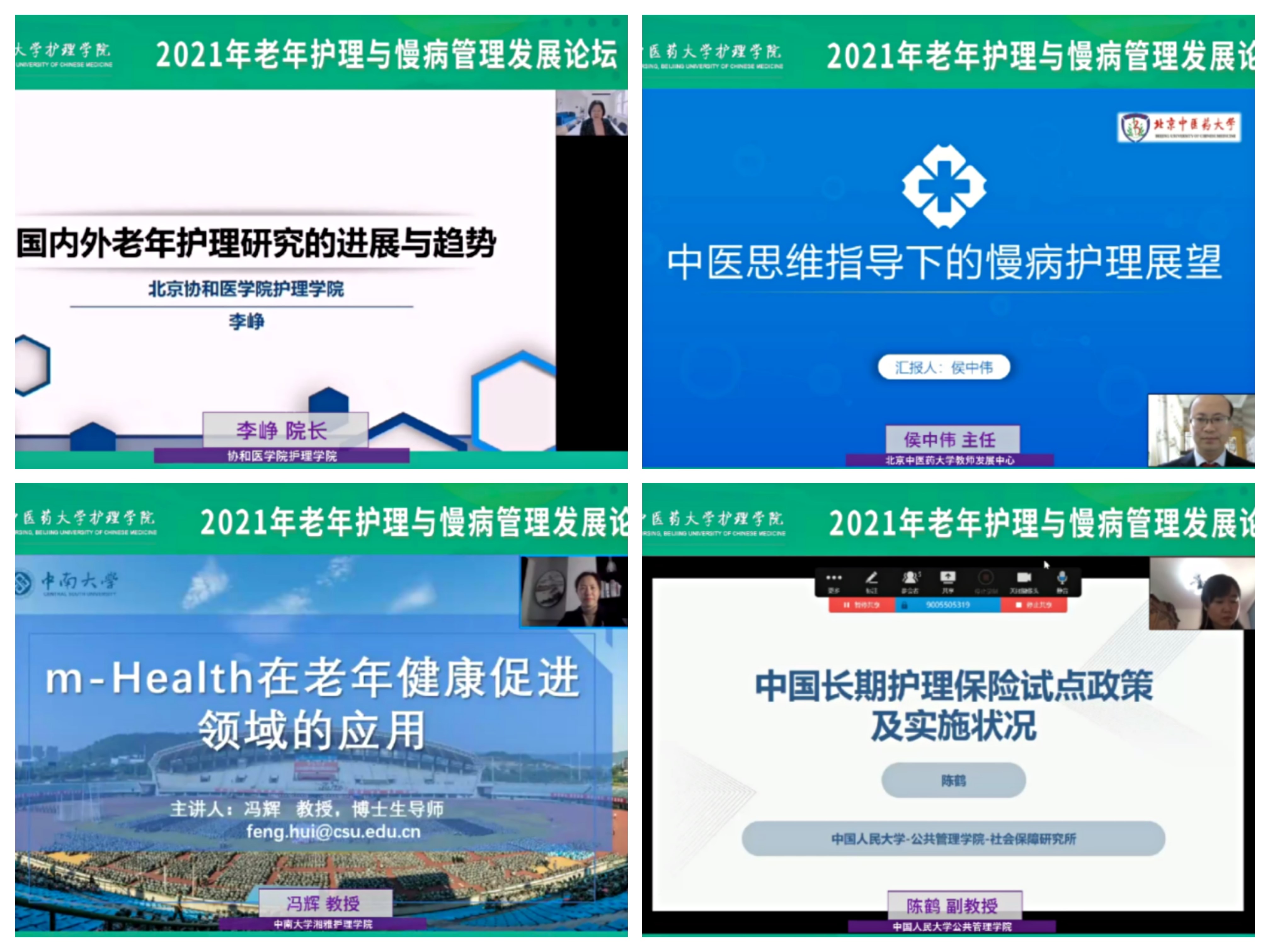 为期两天的论坛采用线上直播的形式进行,精彩纷呈。协和医学院今年会jinnianhuicom院长李峥教授讲授了国内外老年护理研究现状和热点话题。金年金字招牌诚信至上教室发展中心侯中伟主任对于中医理念和中医技术在老年护理和慢病管理发挥的作用有了新的诠释。中南大学湘雅今年会jinnianhuicom冯辉教授则阐述了当前移动医疗设备及可穿戴设备等智慧健康管理技术的发展趋势,同时介绍了其在老年健康促进领域的应用。中国人民大学公共管理学院陈鹤副教授讲解了中国长期护理保险试点政策及实施状况。