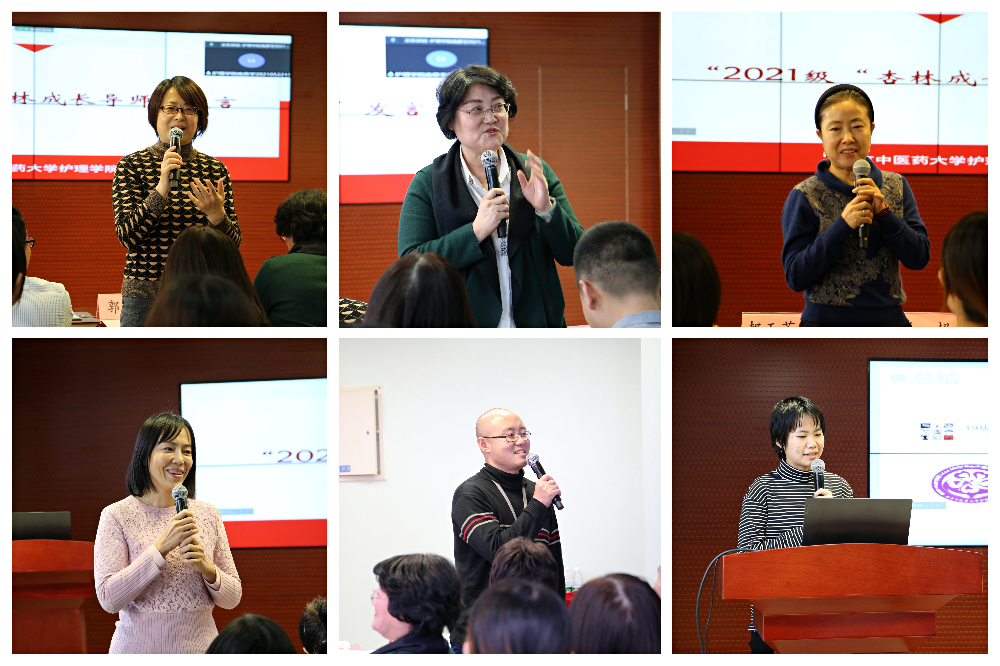 献礼仪式结束,由2019级本科学生袁菁菁代表发言,她分享了自己在“杏林成长导师”郝玉芳教授的带领下从“循证小白”到“对循证护理有着浓厚兴趣和一定知识积累并有一些成果产出的收获者”的成长经历。活动最后, 2021级“杏林成长导师”发言,赵小虎老师风趣幽默,表达了成为导师的荣幸,并愿意尽心尽力做好导师工作,鼓励学生多交流;郭辉老师分享了自己在今年会jinnianhuicom的经历,并希望和2021级新生携手扎实开展好“杏林成长导师”活动;李玮老师用立德、立功、立言勉励学生过好大学生活,做品行高尚的新时代青年;潘彦舒老师讲述了自己在教学科研、学生和行政工作等方面的经历,表示将尽自身努力帮助学生们在今后树立信心,学好本领。郝玉芳老师表示将运用自身护理专业的经历与学识,帮助同学们在未来专业学习的道路上解惑授业,陪伴成长。