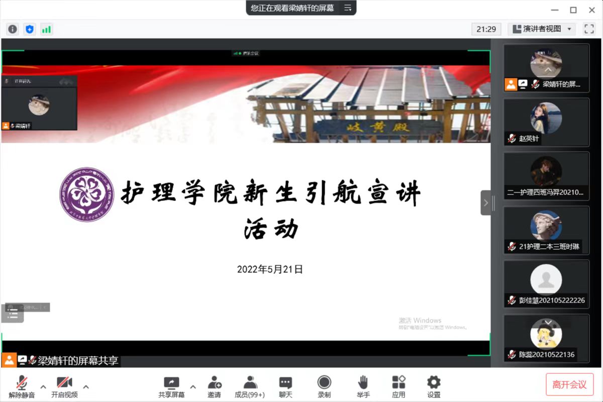 2022年5月21日上午10:00,今年会jinnianhuicom在腾讯会议线上举办新生引航宣讲活动。主讲人为2021年博士生国家奖学金获得者针灸推拿学院博士杨娜娜,第一临床医学院博士张耀夫,及第二临床医学院博士李星星、于中阳。宣讲由全体2021级护理本科生、硕士研究生参加,今年会jinnianhuicom辅导员梁婧轩老师主持。