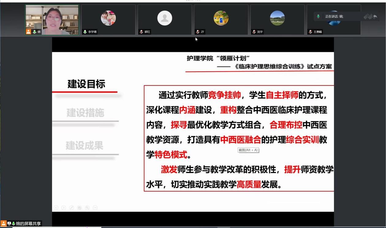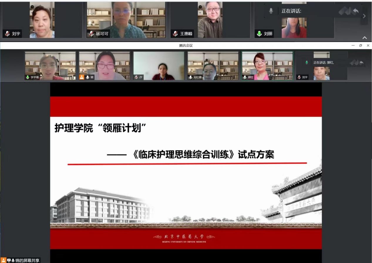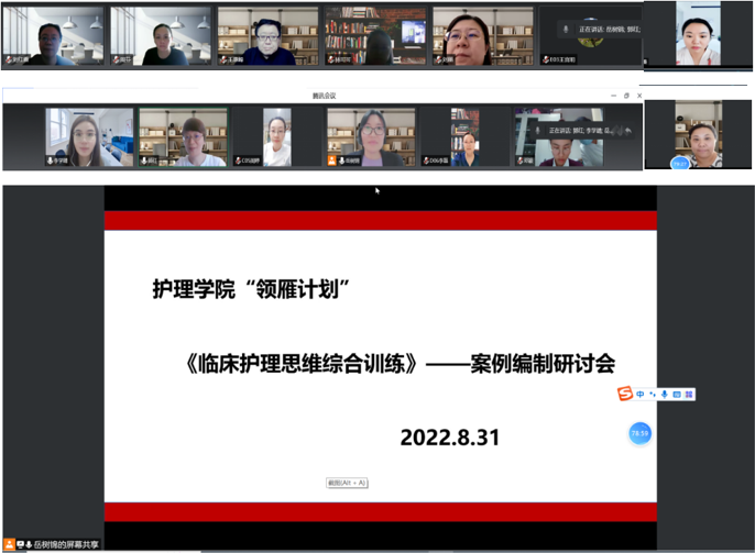 我院为深化课程内涵建设,提升师资教学水平,拟在必修课《临床护理思维综合训练》实行教师挂牌授课,学生自主择师的方式,使学生在择师过程中享有更大的自主权,进而调动师生参与教学改革的积极性,突出优秀教师的引领示范和辐射作用。2022年7月25日,学院开展了“领雁计划”课程研讨会,与会教师有郭红、刘红霞、刘宇、周芬、王慧峰、林可可、刘丽、李学靖等,会议由岳树锦副院长主持。
