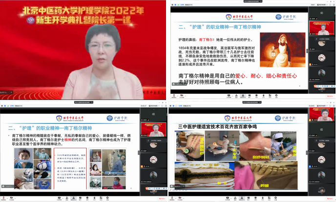 最后,刘香弟院长为新生开启院长第一课。刘院长通过什么是“护理”、“中医护理学”开启,为同学们解读南丁格尔精神、护理职业前景、当代护士的重要地位和中医护理面临前所未有的发展机遇,激发同学们对护理专业的自信与热爱。她为同学们展示了许多中医护理技术的推广和发展,在中医药正走向全世界的进程中,激励同学们也能为中医护理的传承与发展贡献力量。