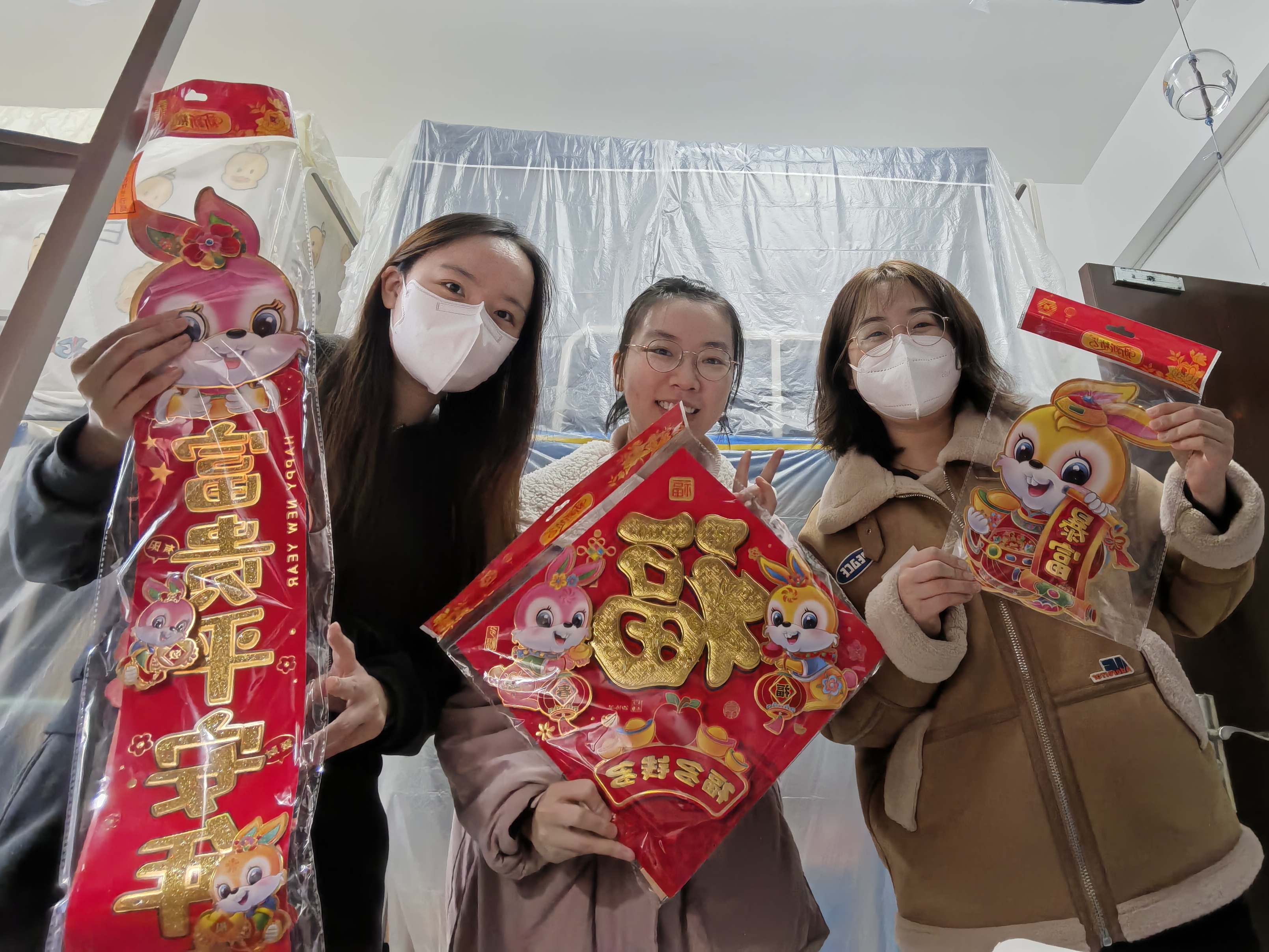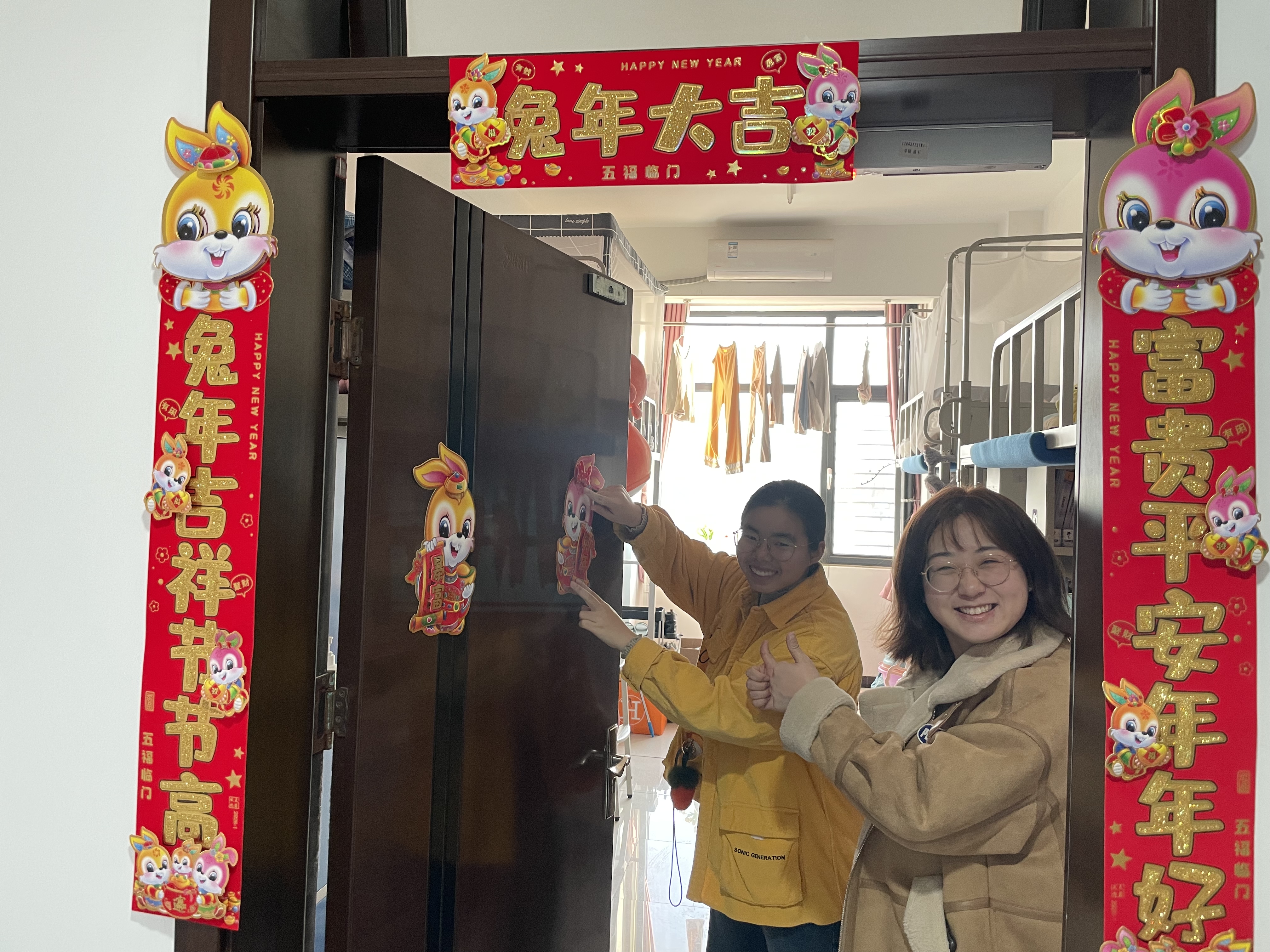 良乡校区,学院老师逐一拜访留宿同学宿舍,送上兔年定制春联、小兔门神、兔年福字等,并与同学们一起张贴春联,做好迎接新年的准备。亲切的慰问承载着学院对留校学生深深的祝福与浓浓的关爱,让同学们感受到犹如家人般的牵挂和关心。同时,老师们在宿舍与同学小叙家常,谈谈学习、聊聊未来畅想,并叮嘱好假期安全用电、合理安排时间,遇到困难和问题及时和辅导员老师反映。同学们表示虽然身在良乡校区却感受到浓厚的年味和“家”的温暖,感谢老师们送来的祝福,也祝愿学院兔年大吉、万事顺遂。