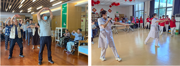 党员师生们带领老人们练习传统八段锦。伴随着悠扬的音乐,老人或站或坐,都跟着领操师生认真学习八段锦,意动行随,老人们都表现出对八段锦浓厚的兴趣和热情。