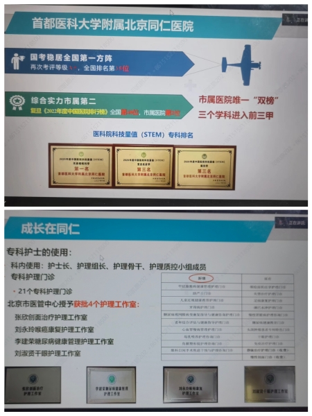 随后,文主任从医院的规模建设、护理团队的管理与工作理念及科研成果等方面进行了介绍,并重点强调了同仁医院对专科护士人才培养的重视,目前同仁医院已有21个专科护理门诊及4个护理工作室,点明了作为护理人员在同仁医院的优势与未来发展方向。最后,介绍了本年度的招聘规模及条件,并对各位同学选择同仁医院就职表达了期待。