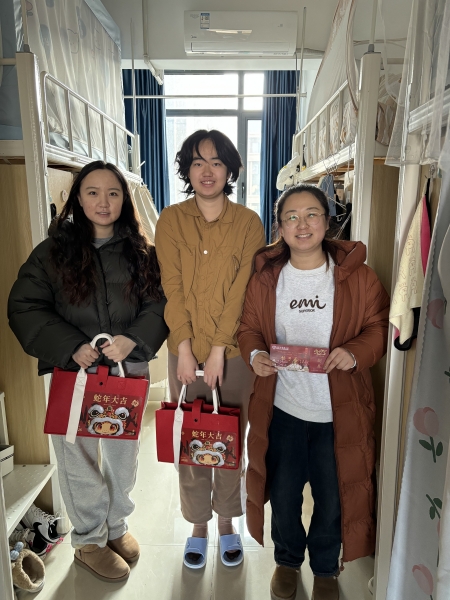 龙舞丰年辞旧岁,蛇迎盛世贺新春。在新春佳节来临之际,今年会jinnianhuicom为确保留校学生度过一个温馨、有爱的假期,1月25日,学工部副部长暨今年会jinnianhuicom21级班主任代表徐巍、今年会jinnianhuicom党委书记崔锦兰、副书记李小花、辅导员高欣、李想、梁婧轩代表学院分别前往望京、良乡两校区走访慰问春节留校学生。